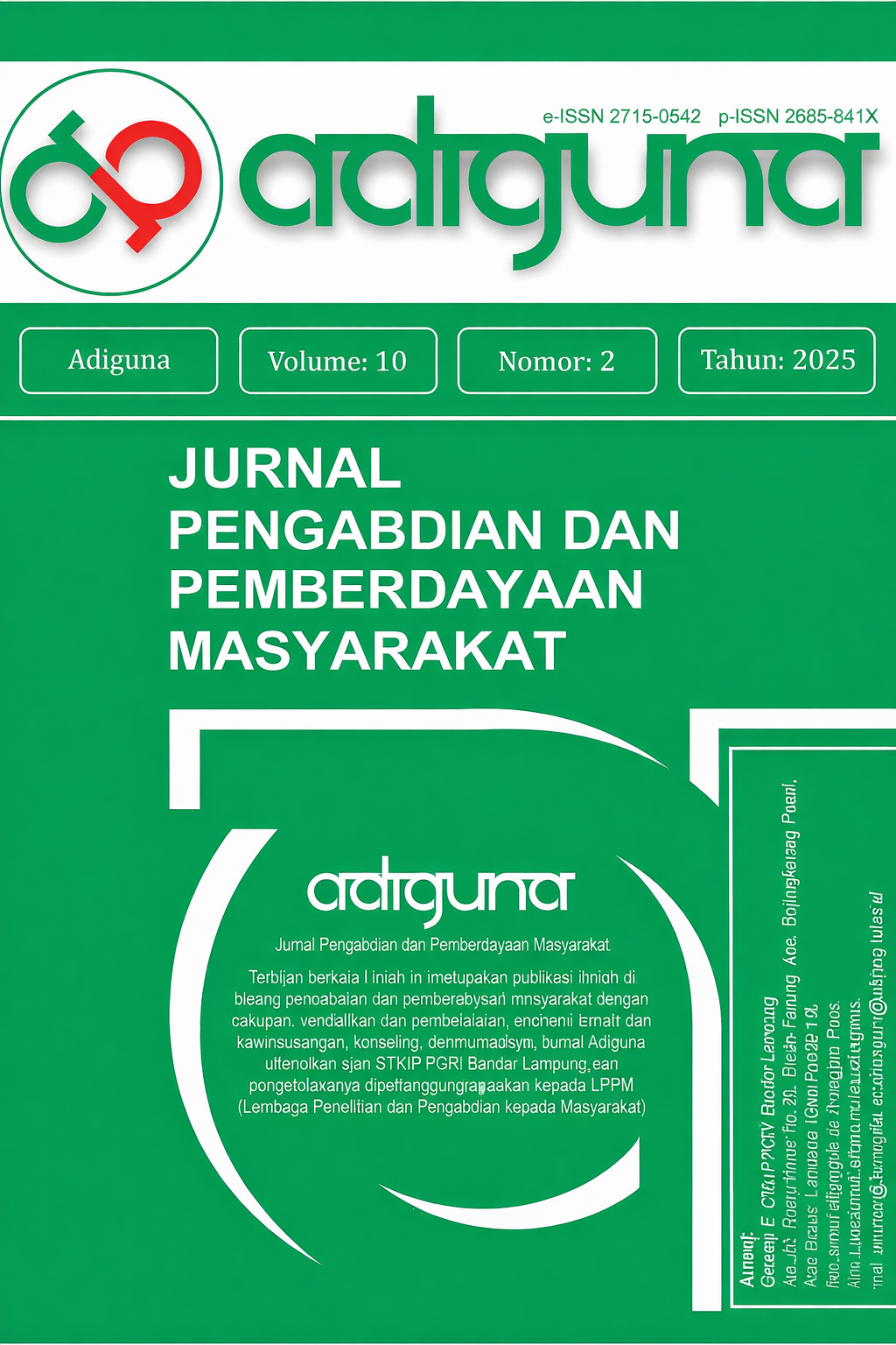 Vol. 10 No. 2 (2025)ADIGUNA: Jurnal Pengabdian dan Pemberdayaan Masyarakat, merupakan publikasi ilmiah berupa artikel luaran Pengabdian kepada Masyarakat atau hasil penelitian yang telah diterapkan kepada mitra (masyarakat) dengan cakupan bidang: pendidikan dan pembelajaran, ekonomi kreatif dan kewirausahaan, konseling, dan humaniora. Jurnal Adiguna diterbitkan oleh STKIP PGRI Bandar Lampung dan pengelolaannya dipertanggungjawabkan kepada LPPM (Lembaga Penelitian dan Pengabdian kepada Masyarakat) STKIP PGRI Bandar Lampung.